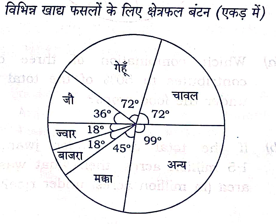 12. नीचे दी गई वृत्त सारणी विभिन्न खाद्य फसलों के लिए आवंटित भूमि -बंटन ( एक गांव में ) को प्रदर्शित करती है। वृत्त सारणी का सावधानी से अध्ययन कर नीचे दिए गए प्रश्नों के उत्तर दीजिए :